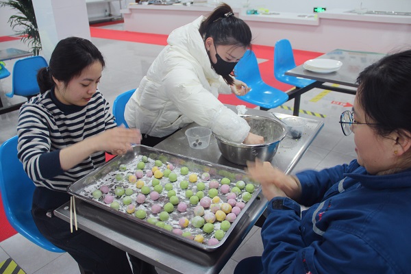 據傳,湯圓起源于宋朝。當時的明州(現浙江省寧波市)所興起的一種新奇食品,即用黑芝麻、豬板油作餡、加入少許白糖,外面用糯米粉搓成圓形,煮熟后吃,吃起來香甜軟糯,回味無窮。此時,包湯圓區域熱鬧非凡,大家齊心協力,有的揉面,有的包餡,有的燒水,不一會,一顆顆飽滿五顏六色的湯圓就下鍋煮沸。品嘗著自己親自手工制作的湯圓,員工們臉上洋溢著滿足的笑容。