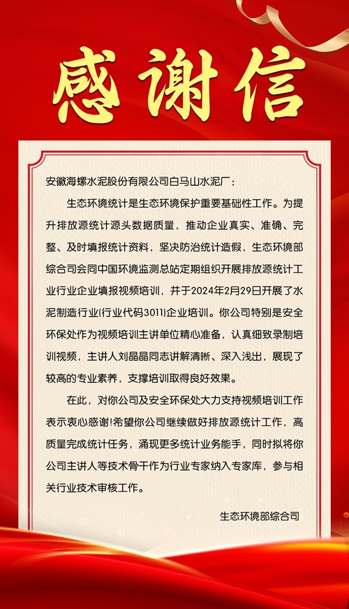 近日,白馬山水泥廠收到了一封來自國家生態環境部的感謝信,信中充分肯定了白馬廠在水泥制造行業企業視頻培訓工作中所做的努力和成效,對白馬廠給予視頻培訓工作的大力支持表示衷心感謝。