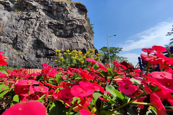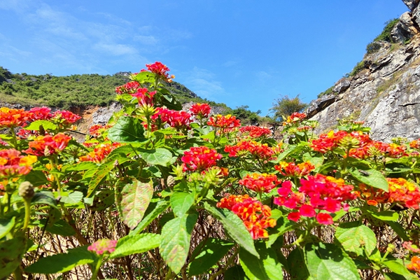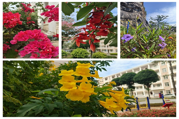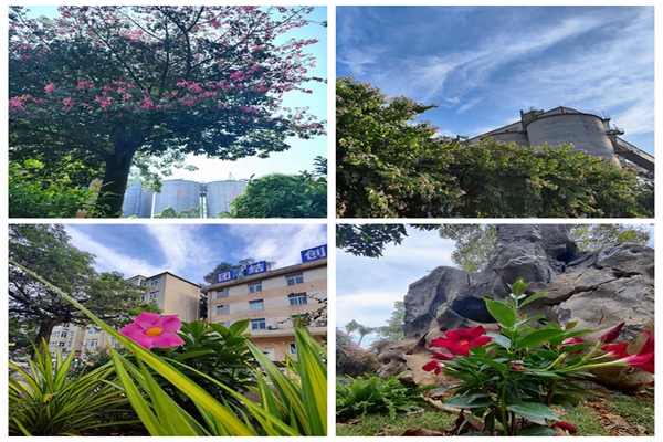 廠區里,黃的、紅的、粉的、紫的、橙的、白的花兒從一叢一叢的綠色中鉆出來,如一個一個精美的調色盤鑲嵌在隆安海螺的秋色大地上。引得路過的職工都禁不住誘惑駐足觀賞、留影。